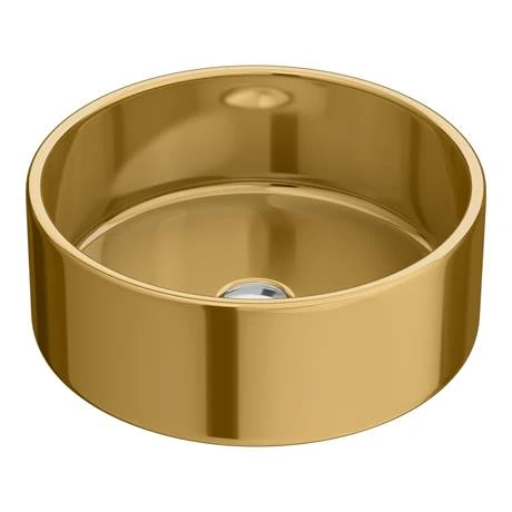 The modern curves of the Arezzo high gloss finish gold effect round counter top vessel basin will make a bold visual statement in any bathroom. Made from high quality vitreous china, the basin is perfect for counter tops and is best complemented with a high rise basin mixer or wall mounted tap. Some small dimensional variation may occur due to manufacturing tolerances. Waste not included.