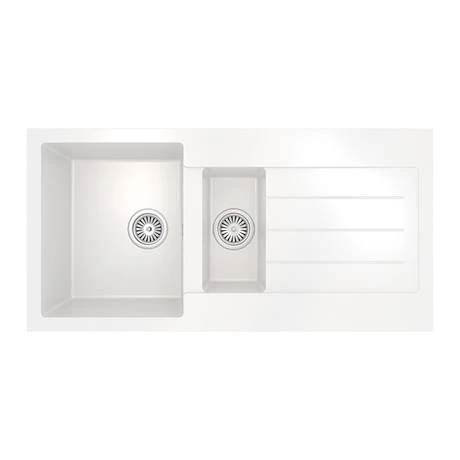 The Venice composite kitchen sink range are constructed from pressed material that is stain, scratch and impact resistant as well as being antibacterial. The sinks can withstand high heat temperatures and are easy to maintain and clean. This 1.5 bowl sink comes in a smooth matt white finish and is fully reversible so the drainer can be on the left or right. Comes supplied with chrome basket strainer wastes.